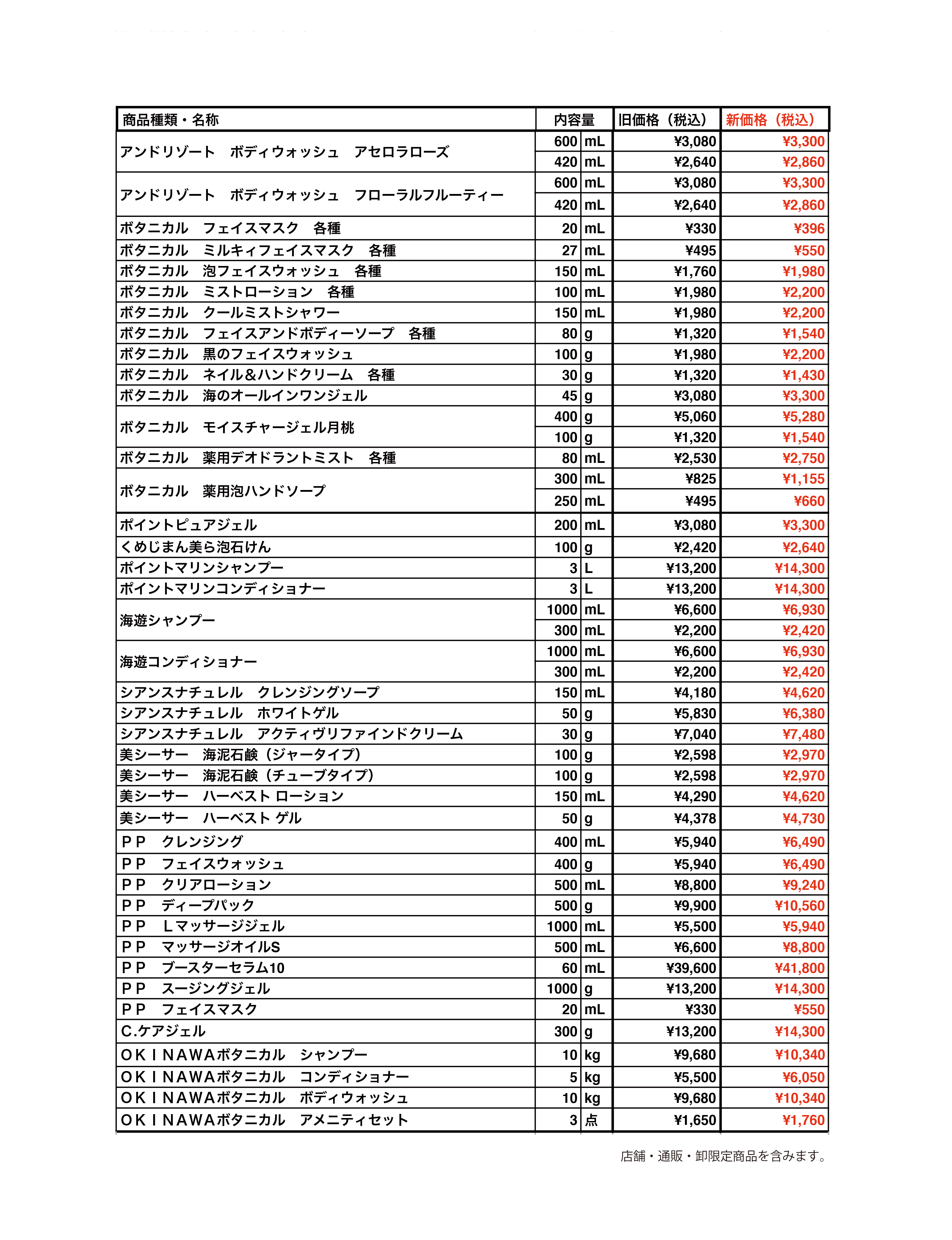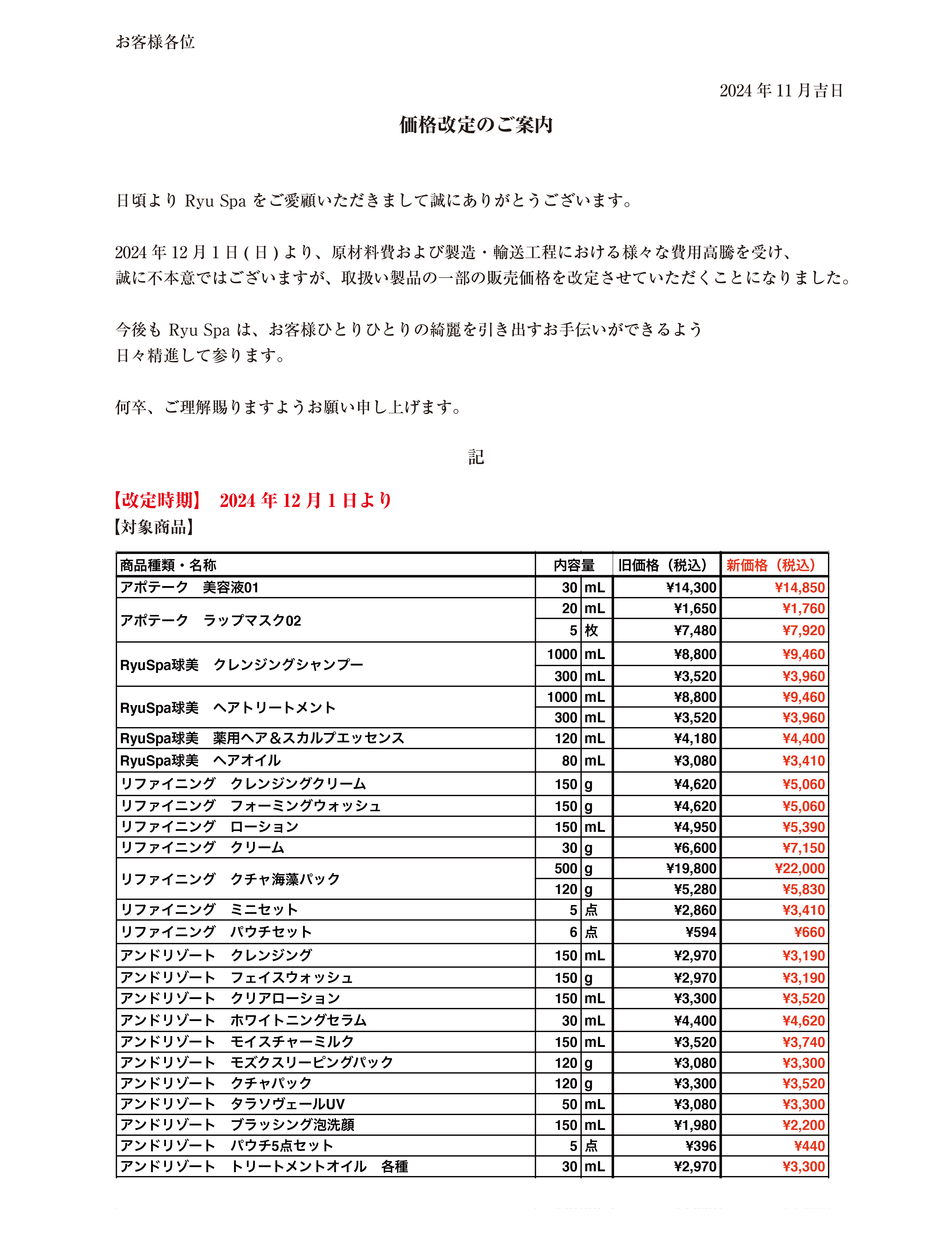 価格改定のご案内