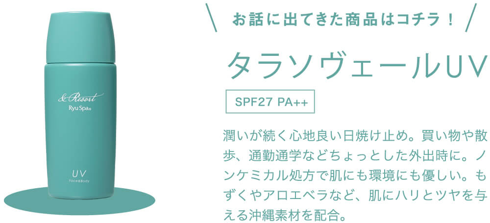 「そうですよね。海洋深層水をベースに海に優しい素材でできていると聞きました。白くなりにくく、すっとなじむテクスチャーで、使い心地もすごくよかったです。私はこれまで、沖縄の自然にたくさん助けられてきたので、そうやって自然への負担の少ないものを選びながら、愛を持って自然と調和していくように生きていけたらいいなと思います」
