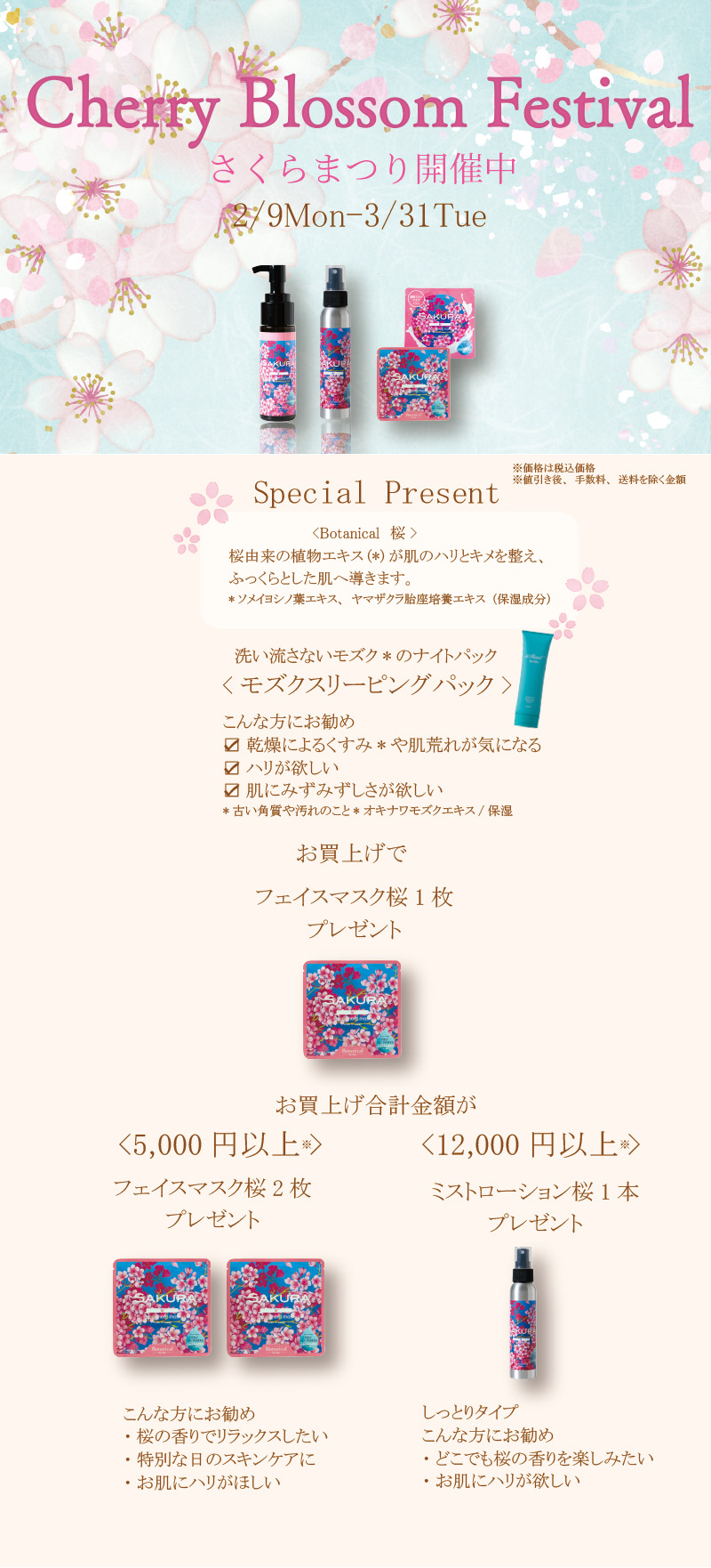 日頃よりRyu Spaをご愛顧いただきまして誠にありがとうございます。 2/9から3/31までの期間限定で さくらまつりキャンペーンを実施いたします。